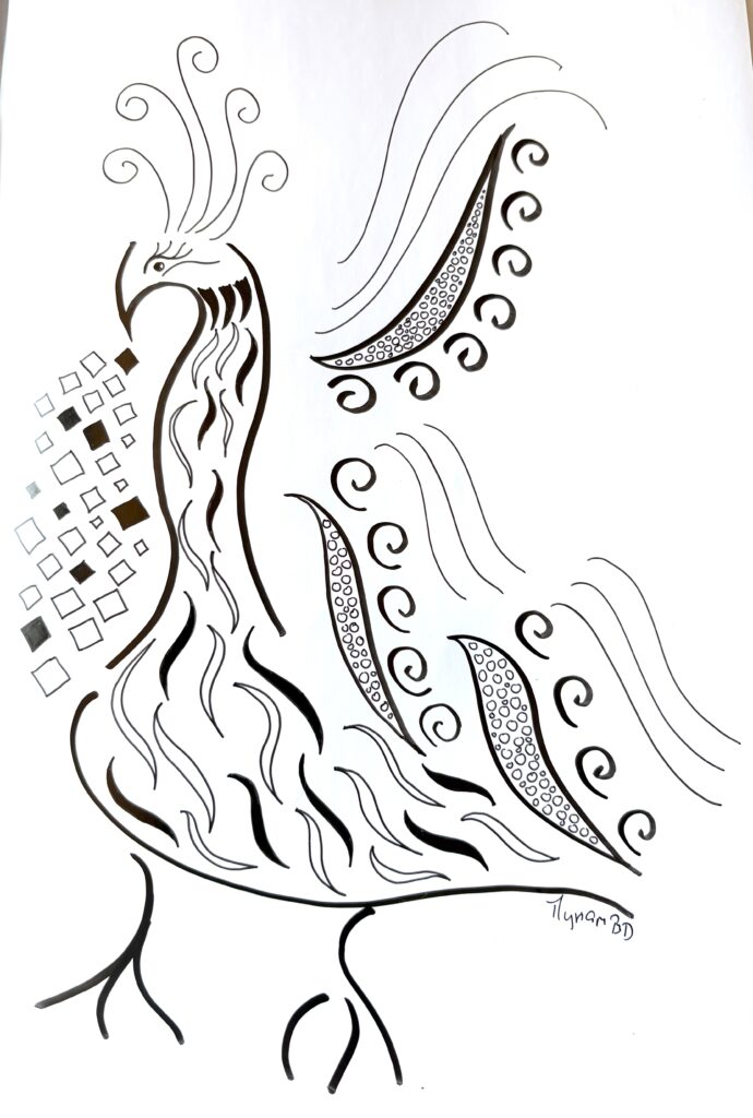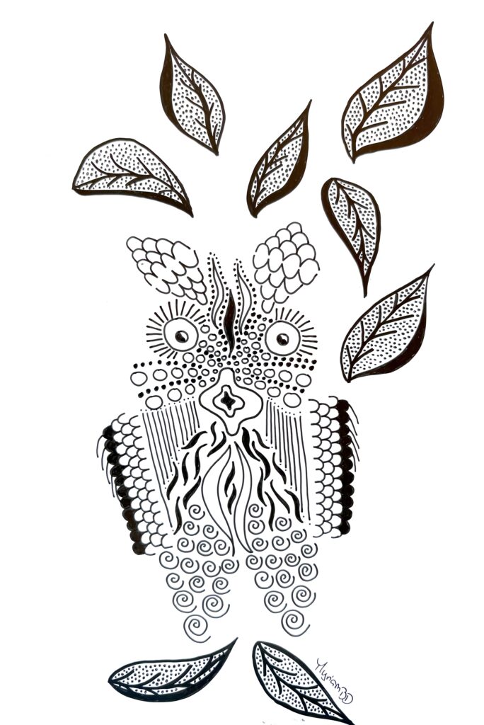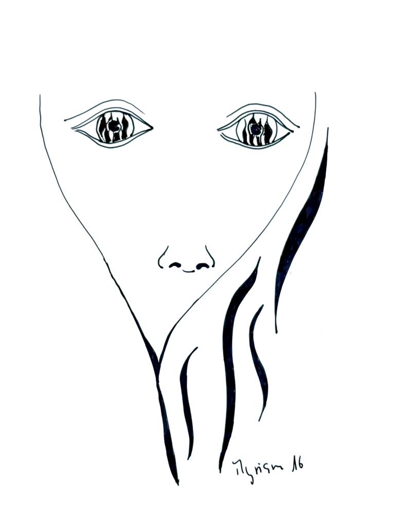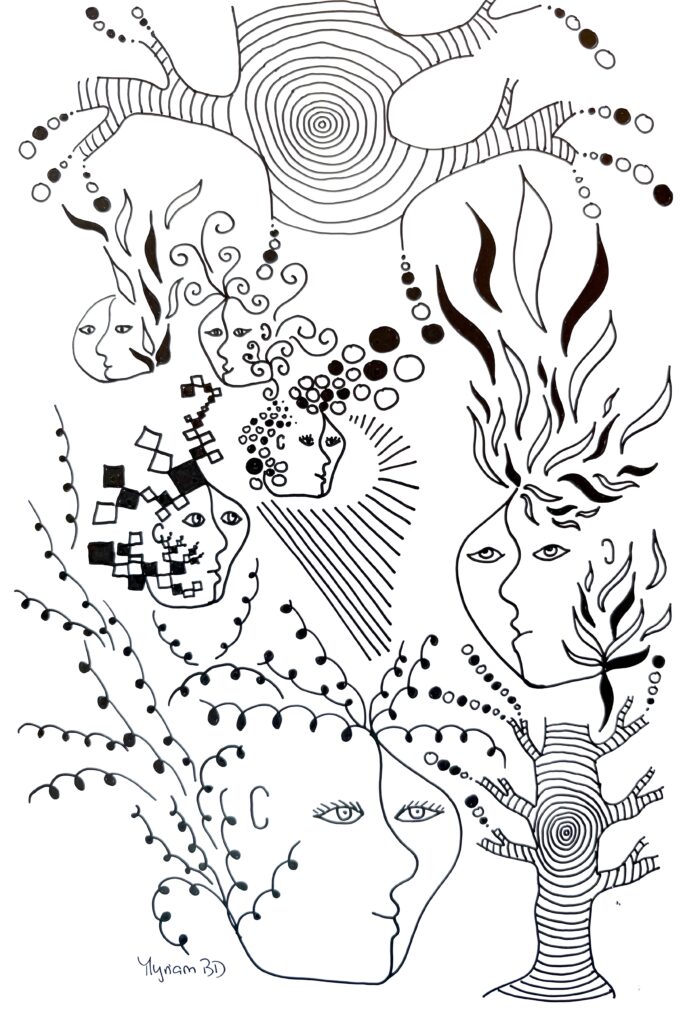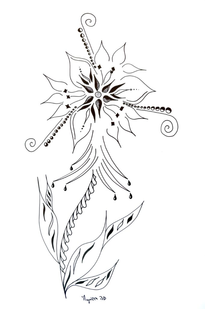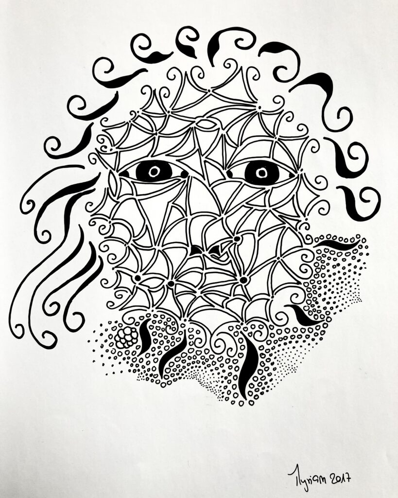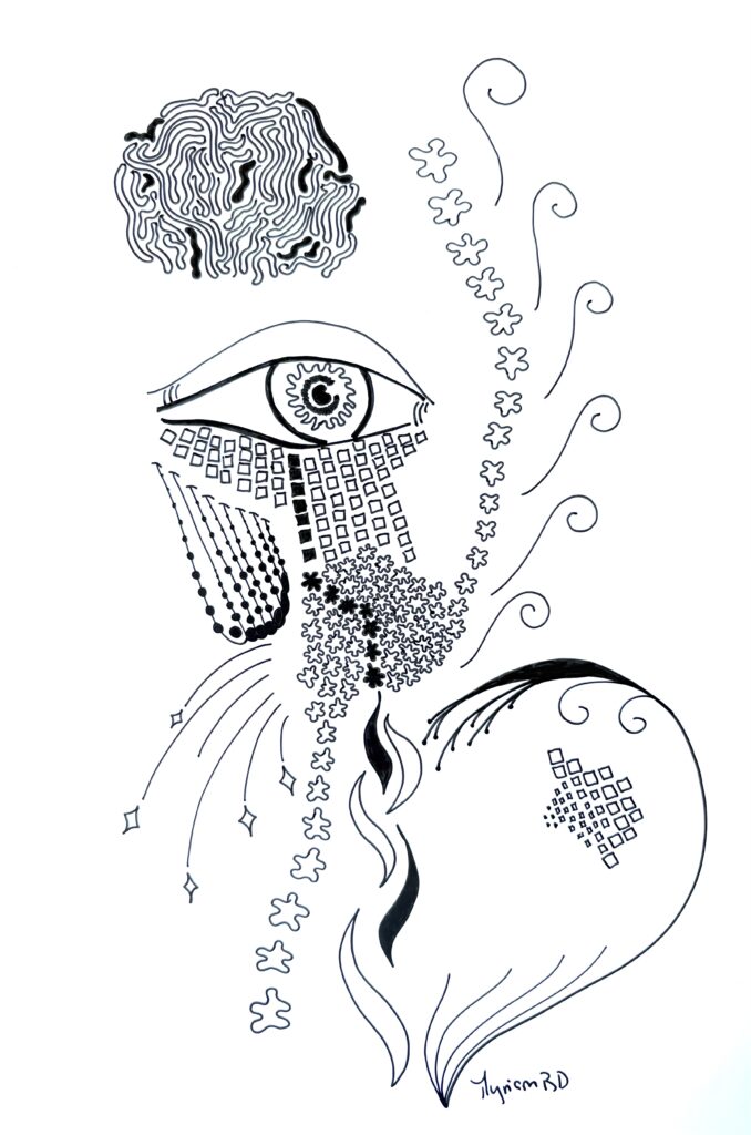 « Encre glisse sur le papier couché et le noir couvre la structure… symboles géométriques répétés… courbes s’élancent et se perdent en points imaginaires… le tout prend forme sans une conscience absolue… art thérapie, abstrait conscient… paix de l’âme. »