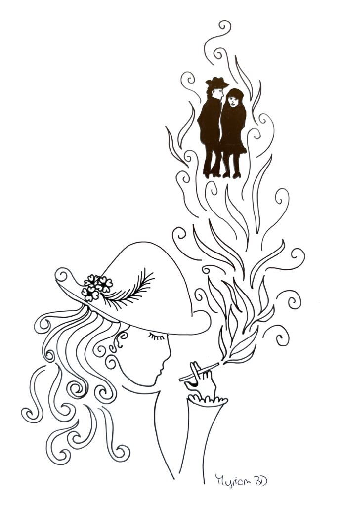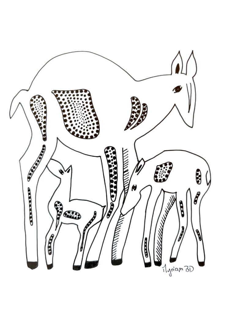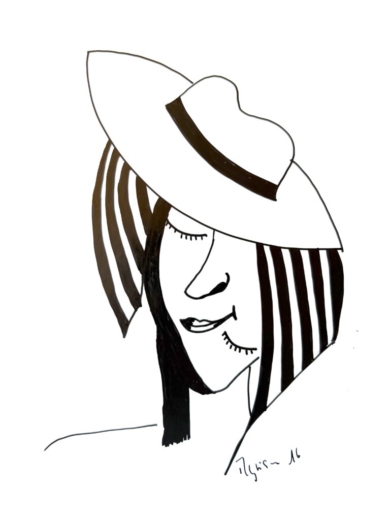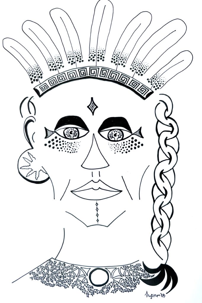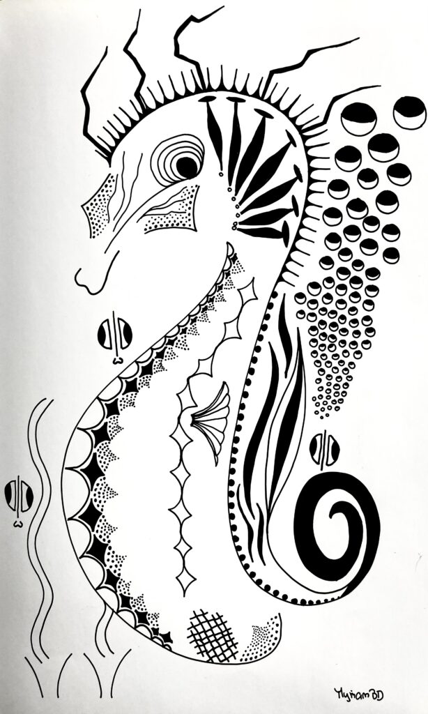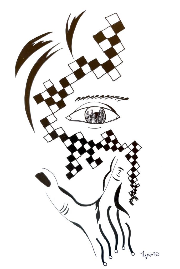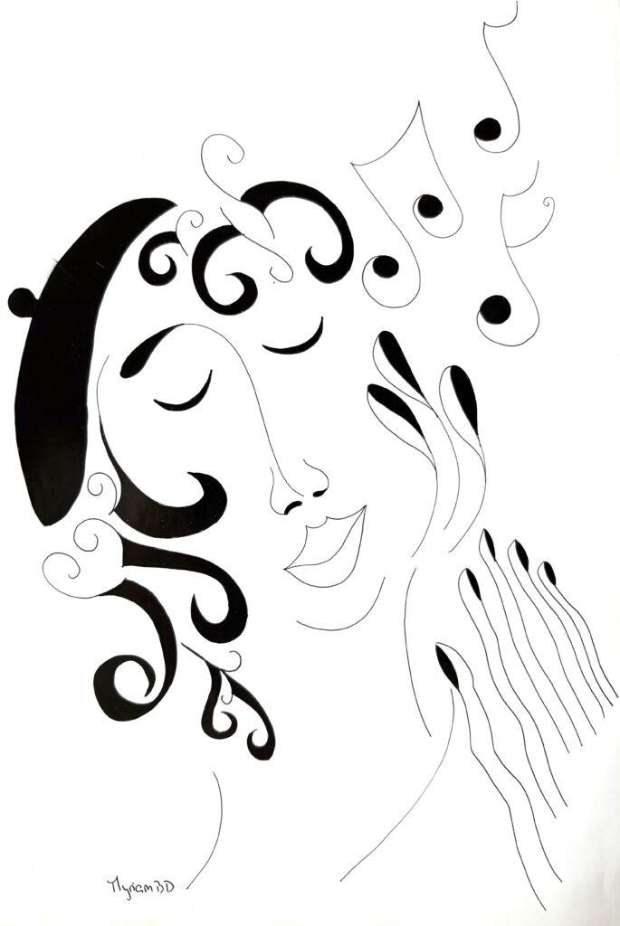 « Encre glisse sur le papier couché et le noir couvre la structure… symboles géométriques répétés… courbes s’élancent et se perdent en points imaginaires… le tout prend forme sans une conscience absolue… art thérapie, abstrait conscient… paix de l’âme. »